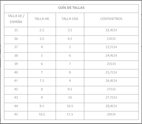 Hay varias maneras de medir las tallas pero la mas fiable sigue siendo los centímetros. para medir nuestro numero es tan sencillo como medir con un metro de punta a punta nuestra plantilla de descarga que utilizamos habitualmente. También podemos guiarnos de la etiqueta de la lengüeta de nuestro antiguo calzado.